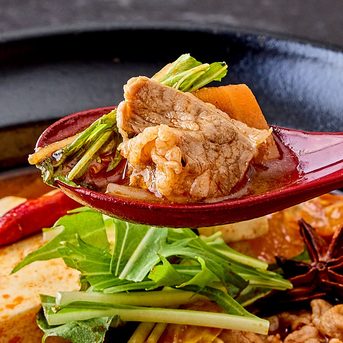 旨辛いスープと具材を一緒に食べれば、ごはんが進むこと間違いなし。