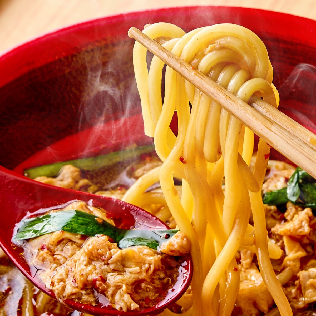 Our rich, umami-packed spicy broth is topped with fluffy egg and fresh garlic chives.