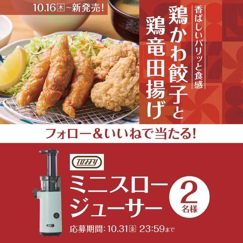 このたび日本国内の「やよい軒」では、やよい軒公式X・公式Instagramにおいて、『鶏皮餃子と鶏竜田揚げの定食』発売を記念して、Xでは「やよい軒お食事券」、Instagramでは「Toffy ミニスロージューサー」が当たる!キャンペーンを実施いたします。
