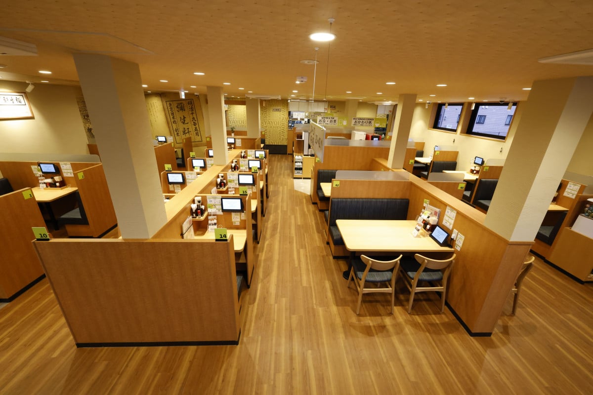 当店舗は2023年12月に公開しましたロゴ・シンボルマークなど新しいブランドイメージを表現した店舗となっております。ロゴ看板、モダンな“和”をイメージさせる暖簾(のれん)や「やよい軒」の名前のルーツでもある“彌生軒(やよいけん)”の歴史的資料をモチーフとした壁紙など、ブランドステートメントを表現する“上質な”イメージでデザインされた店舗です。また、ゆっくりとメニューを選んでいただけるようテーブルに設置したタブレット端末からのオーダーや店舗限定デザートメニューの導入、さらにドリンクバーを設置することでくつろぎの時間を過ごしていただけるようにしました。 もちろん、“ごはん”や“だし”、“漬け物”のおかわり自由が楽しめる『おかわり処』もございます。