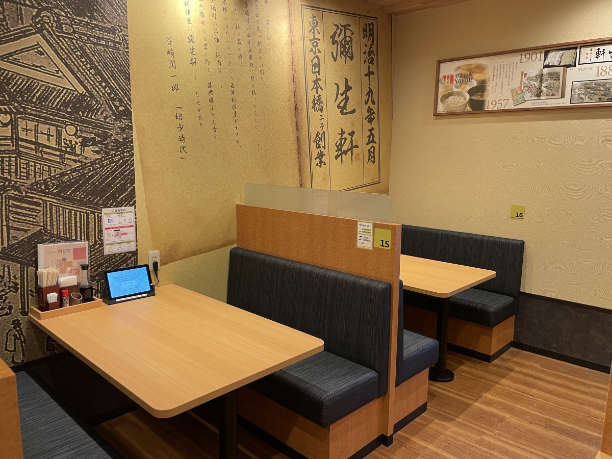 当店舗は2023年12月に公開しましたロゴ・シンボルマークなど新しいブランドイメージを表現した店舗となっております。ロゴ看板、モダンな“和”をイメージさせる暖簾(のれん)や「やよい軒」の名前のルーツでもある“彌生軒(やよいけん)”の歴史的資料をモチーフとした壁紙など、ブランドステートメントを表現する“上質な”イメージでデザインされた店舗です。また、ゆっくりとメニューを選んでいただけるようテーブルに設置したタブレット端末からのオーダーや店舗限定デザートメニューの導入、さらにドリンクバーを設置することでくつろぎの時間を過ごしていただけるようにしました。 もちろん、“ごはん”や“だし”、“漬け物”のおかわり自由が楽しめる『おかわり処』もございます。