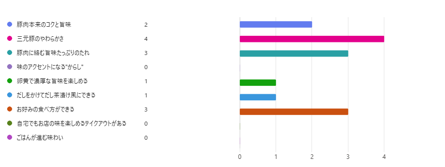 最も多くの票を集めたのは「三元豚のやわらかさ」でした。続いて「豚肉に絡む旨味たっぷりのたれ」、「お好みの食べ方ができる」が同率2位という結果となりました。