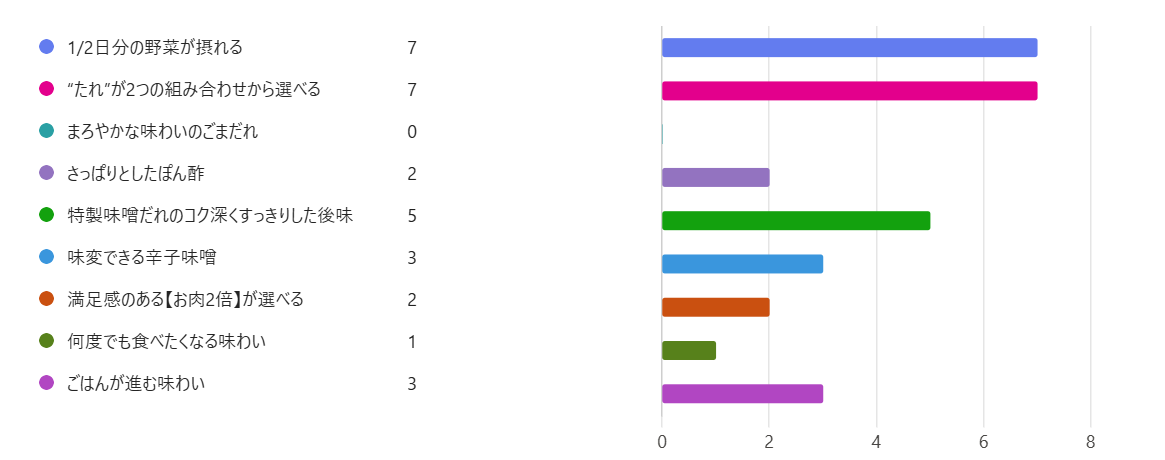 調査の結果、「1/2日分の野菜が摂れる」「“たれ”が2つの組み合わせから選べる」というポイントが同率1位でした。たっぷりの野菜を手軽に摂れる点に加え、気分や好みに合わせて“たれ”を選べる楽しさが支持を集める結果となりました。