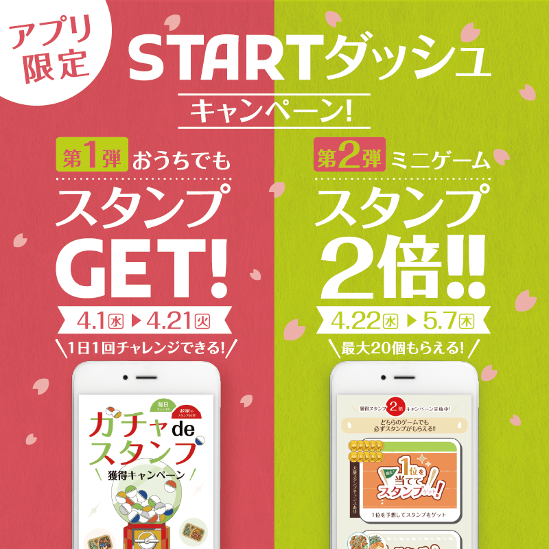 その第1弾として、おうちでも公式アプリからスタンプが獲得できる『ガチャdeスタンプ』を4月1日(水)より開始いたします。さらに、4月22日(水)からは、第2弾として店頭来店時にミニゲームで貰えるスタンプが2倍になるキャンペーンも予定しております。